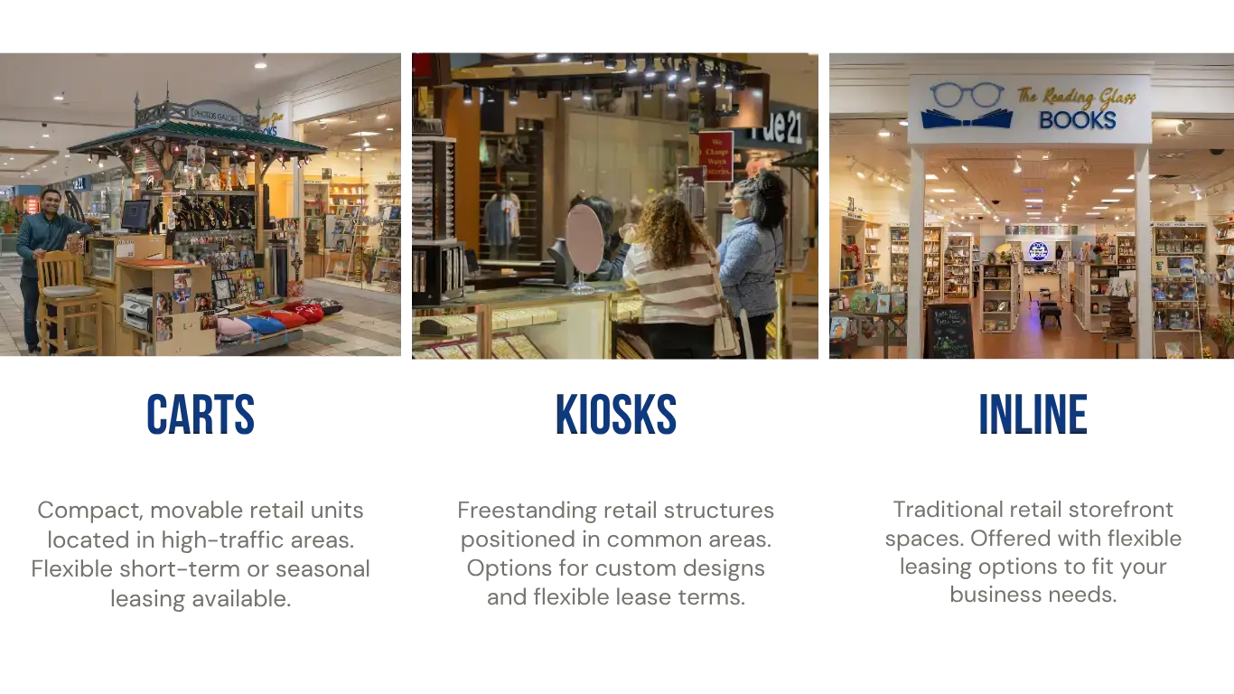 Explore pop-ups, carts, kiosks, in-line stores, and engaging brand activations designed to connect with thousands of shoppers.